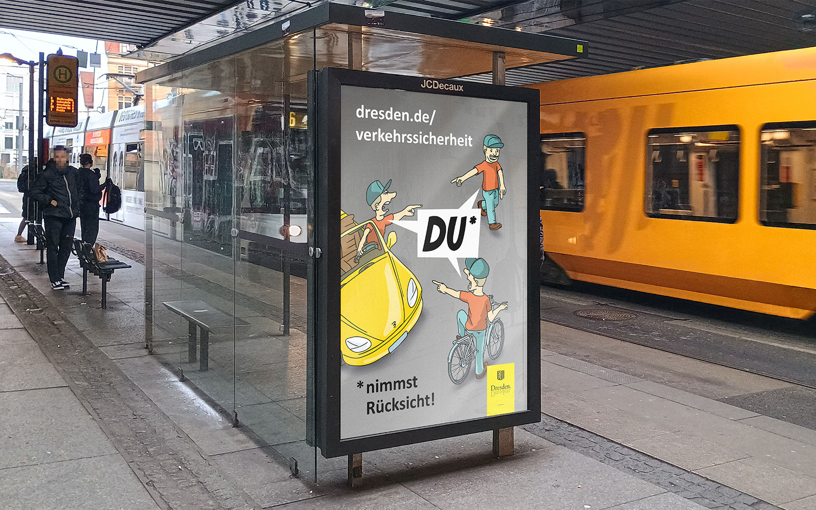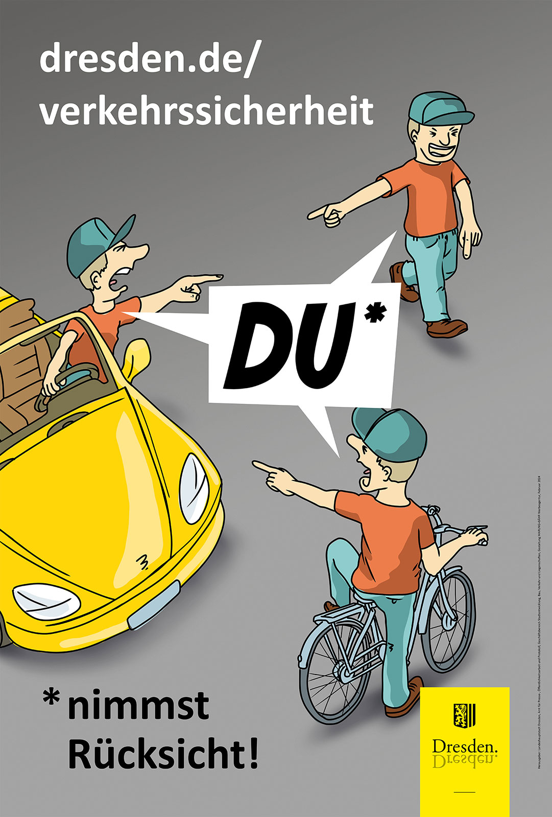 Dresden möchte Verkehrsteilnehmer zu mehr Rücksicht im Straßenverkehr animieren. Das Motiv zeigt ein und dieselbe Person, allerdings gleich dreimal in unterschiedlichen Rollen – Fußgänger, Radfahrer und Autofahrer, die sich gegenseitig beschimpfen und kritisieren. Damit will die Stadt auf die Bedeutung gegenseitiger Rücksichtnahme und Respekt im Straßenverkehr hinweisen.