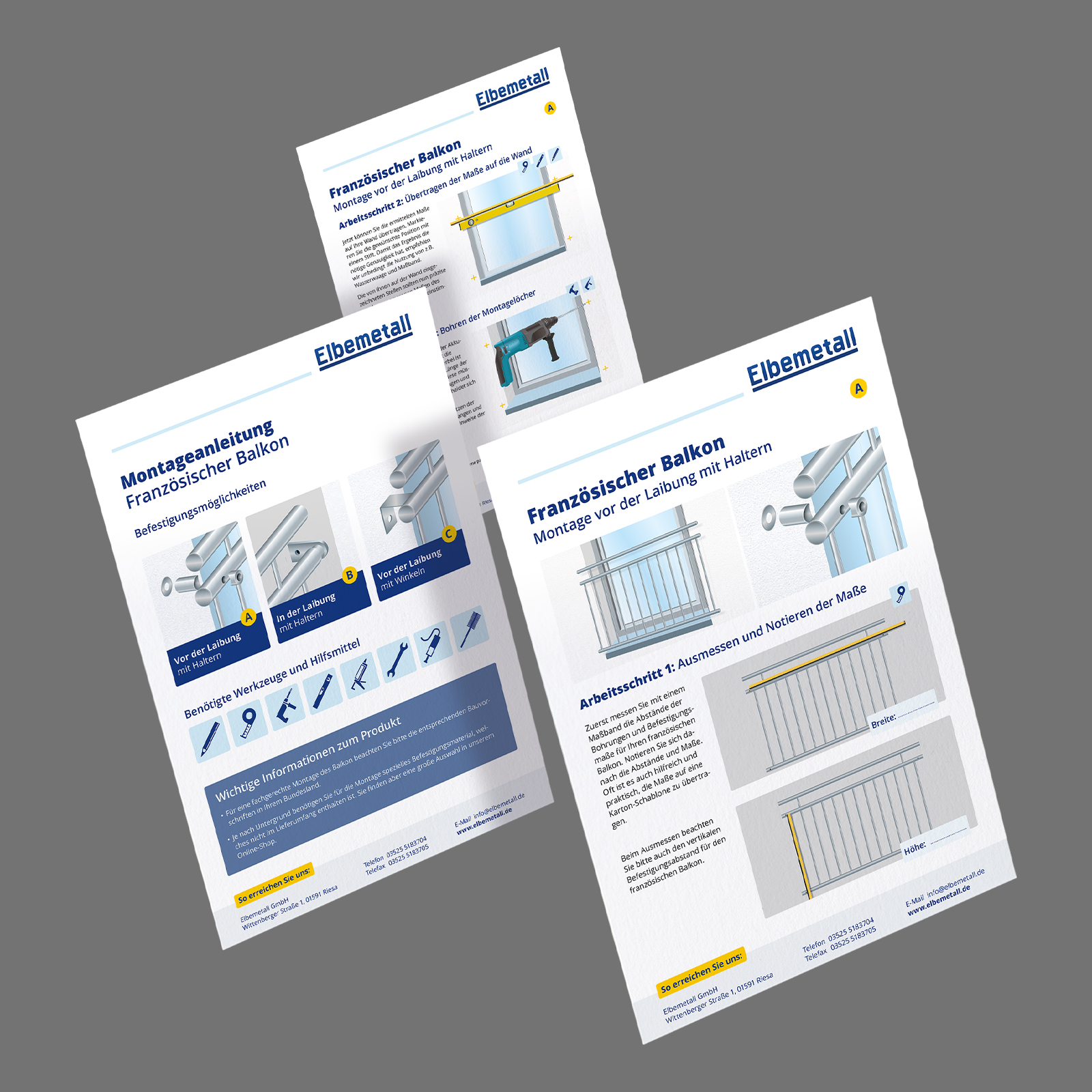 Für den erfolgreichen Onlineshop Elbemetall .de haben wir Montageanleitungen gestaltet. Hauptziel war es, komplexe Montageschritte auf eine intuitive und leicht verständliche Weise zu visualisieren. Durch detaillierte Zeichnungen und eine logische Schritt-für-Schritt-Struktur wird der Montageprozess nachvollziehbar. Die Gestaltung legt Wert auf eine klare Gliederung und die Verwendung von Piktogrammen.